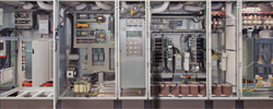 The test stand hardware is divided into three categories. Category 1 and 2 hardware is connected directly to a connection plate on the central station. Category 3 hardware is indirectly connected via a control cabinet. The control cabinets of the individual category 3 modules are supplied with power from the cs. Category 3+ modules with a high power consumption are an exception and have their own feed-in.