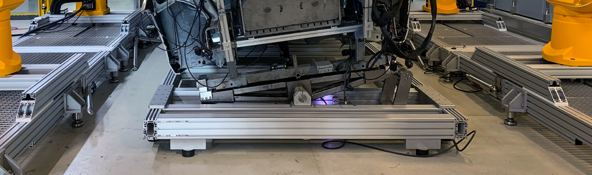 The vehicle body is mounted on the tilt frame via a traverse with four connection points. The frame can tilt laterally from -8° to +8°. This allows different vehicle positions to be simulated, for example, during door tests. The tilt frame is controlled via the central station.