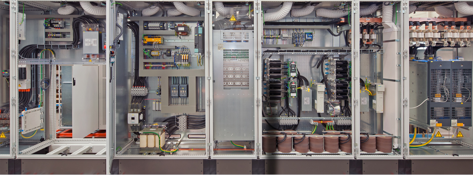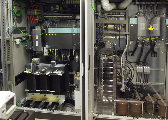 The system consists of a power unit, components from SEMIKRON (SKiiP_613 + capacitor bank + accessories) and the control board. The control module is supplied with setpoints via digital and analog standard interfaces and integrated in the automation system without the need for a fieldbus connection. The power unit is connected directly to the DC link of the drive system and exchanges with this the power, so that the mains voltage is not burdened with the drive power but only with the sum of the losses.
