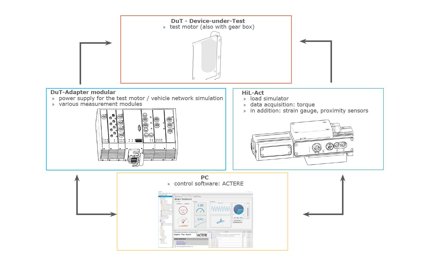 Both device are controlled with our ACTERE – Software, with the user interfaces being compiled according to the specifications of the test stand and the customer requirements.