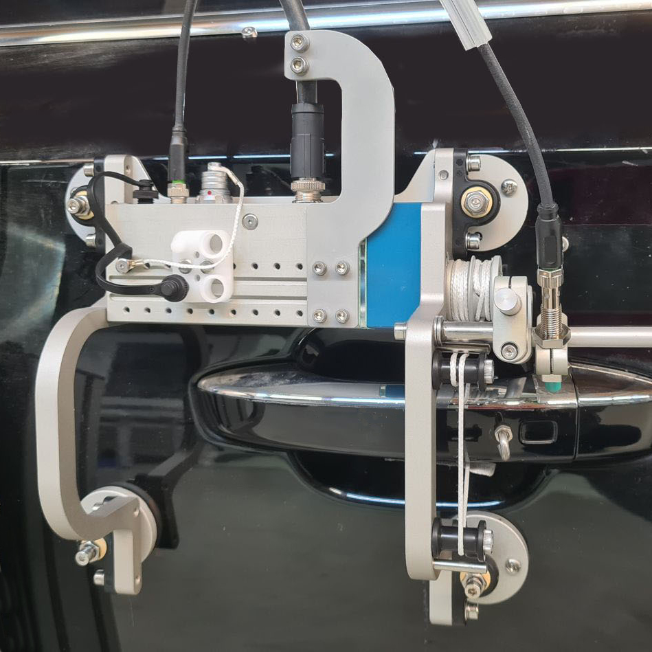 Der xcdt-Testarm öffnet die Tür mittels einer Druckrolle und schließt sie mit einem Zugseil. Während des Testvorgangs wird die Kraft über Kraftsensoren im Testarm gemessen.
